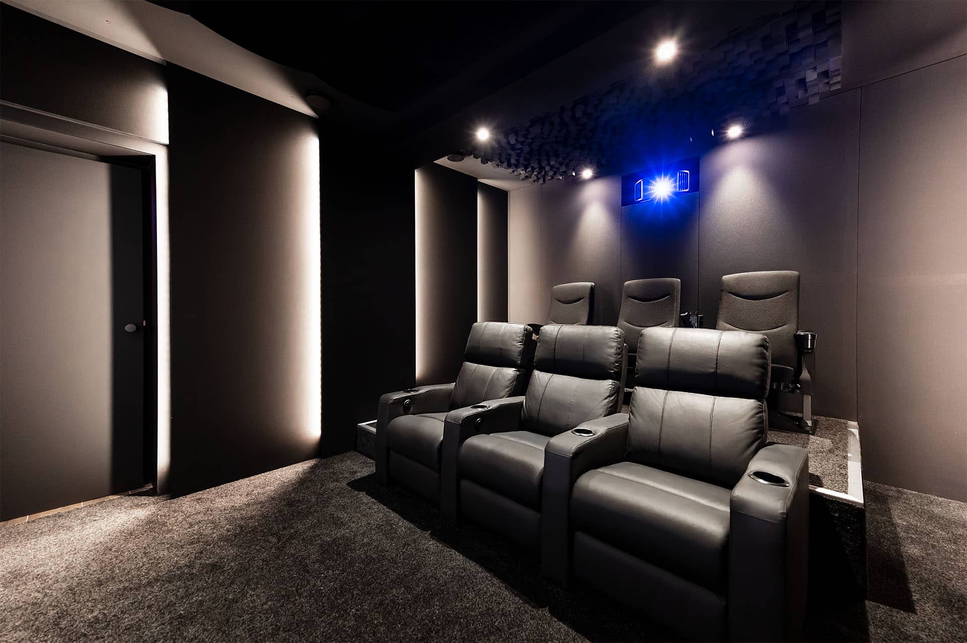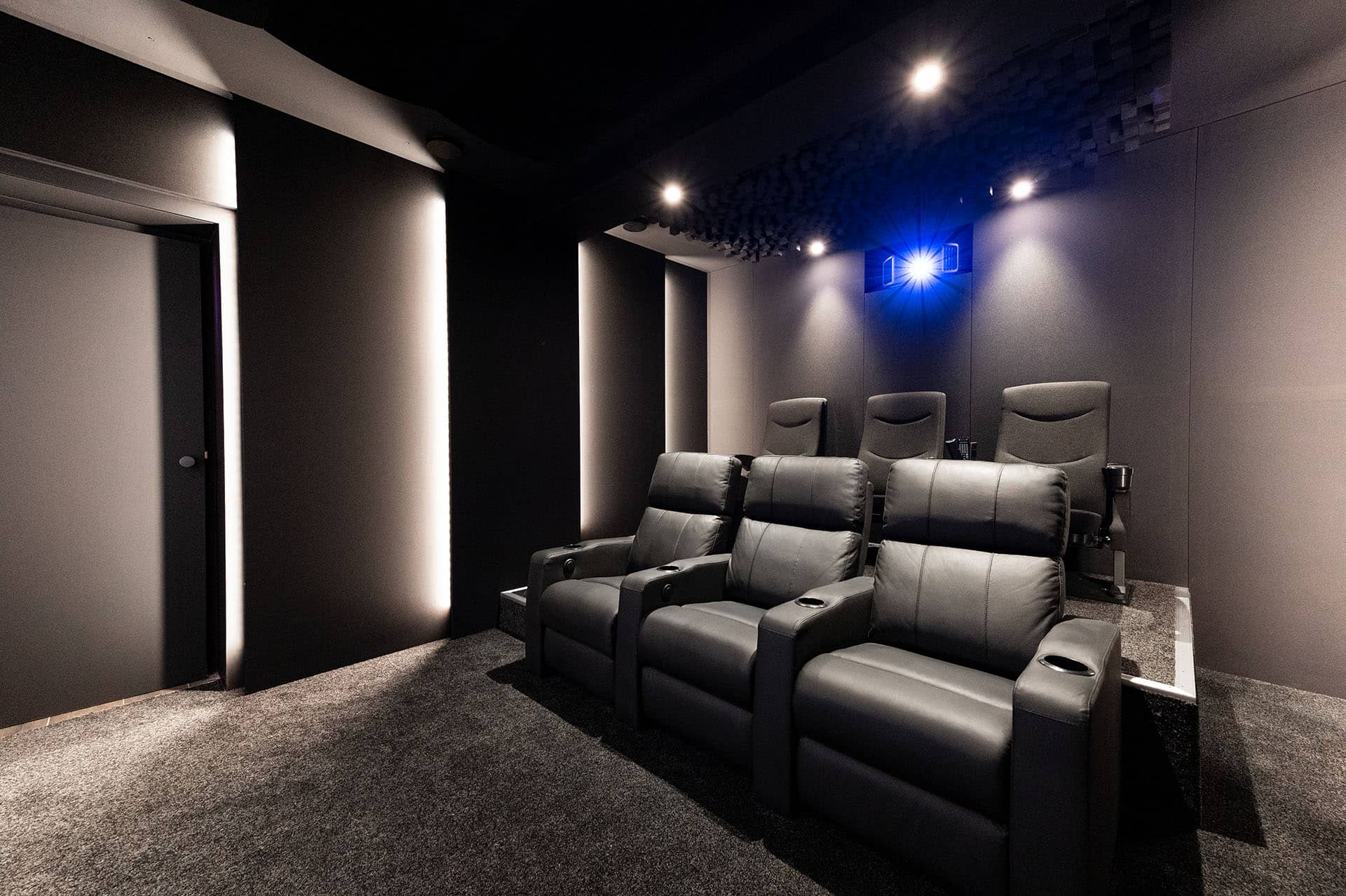 Dieses Heimkino ist Teil eines ganz besonderen privaten Wohnhauskellers mit großem Wellnessbereich und einer sensationellen Bar.
